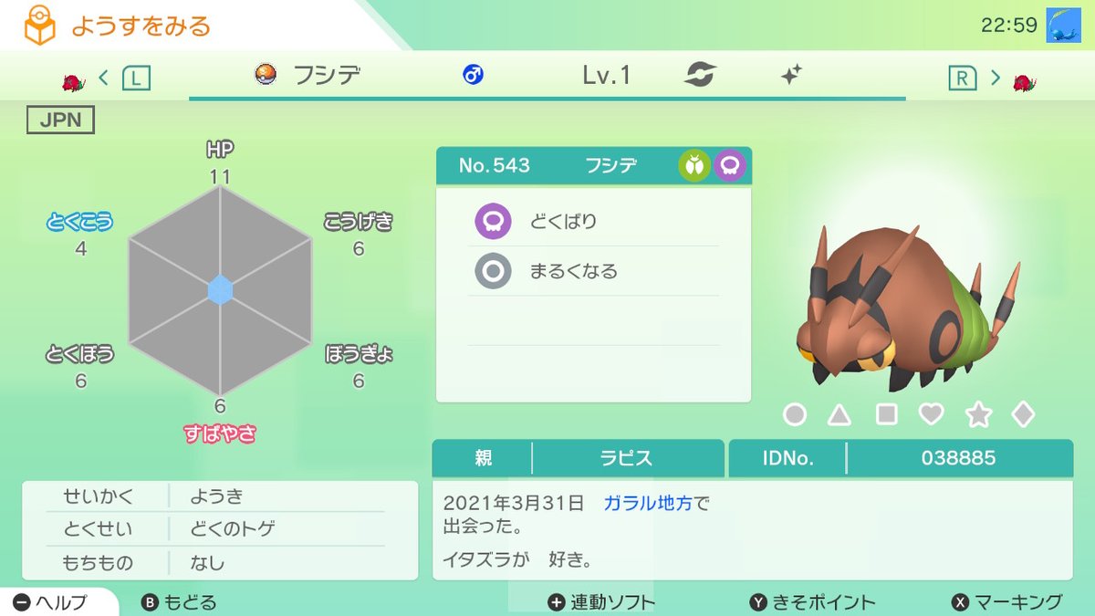 古玉 こだま ほんとはマリルにしようと思ったけど理想とならなかったのでフシデにしました ポケセンで買い物かごに一杯 ペンドラー入れてるトレーナーさんがいたのは記憶に新しいです ルアボで合ってるかは まだ使ったことないのでわかりませーん